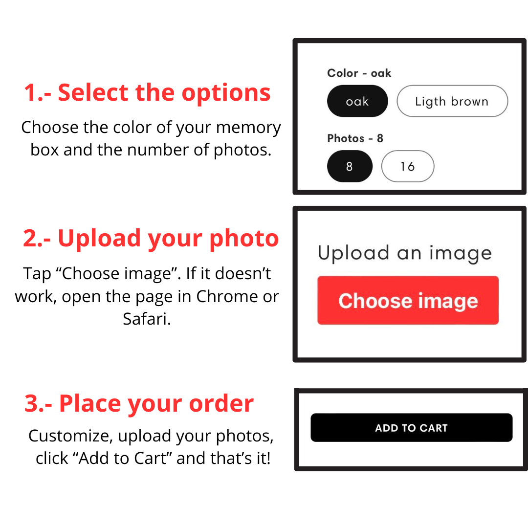 Right above the “Add to Cart” button, you’ll see a button that says“Upload Photos”. You can select pictures directly from your phone gallery or computer — it's quick and easy!